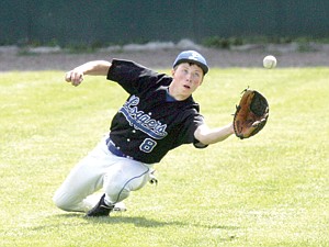 Rightfielder Dylan Lane stretches for the second out top of the eighth in the first game of a doubleheader vs. the Mariners.