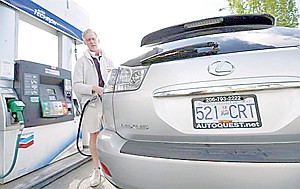 In this Thursday, May 23, 2013 photo, Curt Griffiths, from nearby White Rock, British Columbia, pumps gas at a station in Blaine, Wash. In April 2013, in its 2014 fiscal year budget proposal, the Department of Homeland Security requested permission to study a fee at the nation's land border crossings. The request has sparked wide opposition among members of Congress from northern states, who vowed to stop it. A fee, they say, would hurt communities on the border that rely on people, goods and money moving between the U.S. and Canada. (AP Photo/Elaine Thompson)