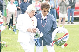 Gold Star Mothers Mary Teater, left, and Marie Wegner carry wreaths to lay at Libby Cemetery during a Memorial Day ceremony Monday. The ladies represent mothers who have lost a child while serving in the military. Teater is a past national president of Gold Star Mothers, having served in 1981 to 1982. Another Gold Star Mother present was Verna Welch and Gold Star siblings Cathy Bache and Patty Rambo.