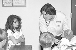 Patient Care Ted E. Bear gets first class treatment from Susan Horelick, R.N., St. JohnÕs Lutheran Hospital education coordinator. Watching intensely is Amber Nixon, second grader at Asa Wood, visiting St. JohnÕs with classmates during National Hospital Week. Chuck Blair photo from the May 19, 1993, files of The Western News.