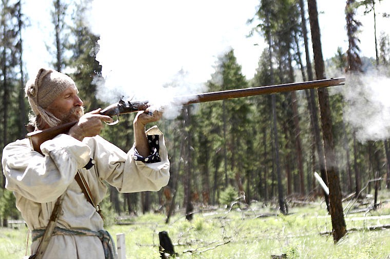 Dressed in authentic clothing from the Revolutionary War era, Dave "Badger Stomper" Sowers of Colton, OR fires his .62 Caliber smooth-bore rifle at a target at the Wildhorse Rendezvous in Mineral County.