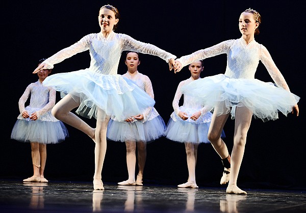 Olivia Potthoff, left, and Emma Lovejoy rehearse for the Noble Dance Spring Recital on Tuesday night, May 28, at the Whitefish Performing Arts Center. The recital is tonight with shows at 6 and 7:30 p.m. Tickets for adults are $10 and kids 12 and under are free. Also shown in the background are Elise Sabine, left to right, Bella Arriaga, and Nina Friedman. (Brenda Ahearn/Daily Inter Lake)