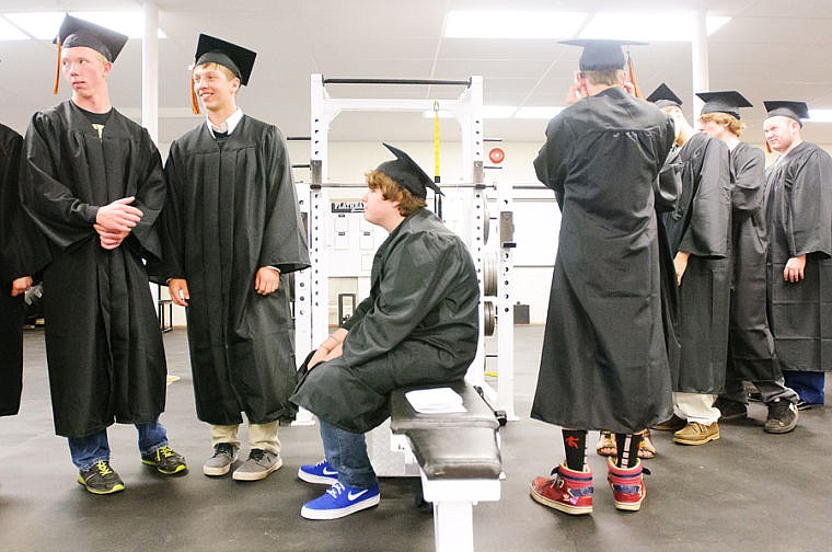 Gage Malczynski, center, sits on a weight bench while waiting for the graduation ceremony to start Friday night at Flathead High School. May 31, 2013 in Kalispell, Montana. (Patrick Cote/Daily Inter Lake)