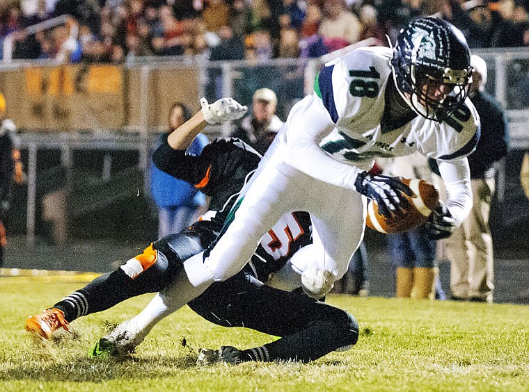 Glacier WIDE RECEIVER Sam McCamley (18) breaks the tackle of a Flathead defender and dives for the end zone to score the first touchdown in the seventh annual crosstown football game Friday night at Legends Stadium.