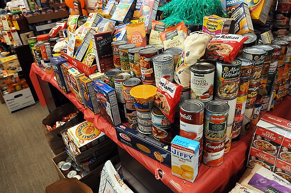 Piles of food were stacked up in U.S. Bank on Friday, November 1, before being weighed. Flathead donations came to 1063 pounds of food and $976 dollars. Glacier donations came to 981 pounds and $360 dollars. For each dollar donation the school were credited for one pound bringing the final total to 2039 pounds for Flathead and 1341 for Glacier. The results were announced last night at the Crosstown football game. (Brenda Ahearn/Daily Inter Lake)