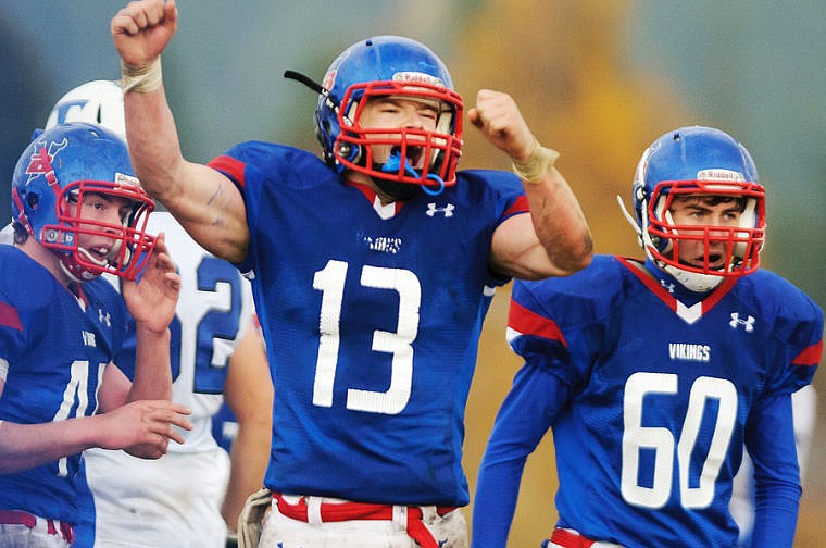 Bigfork senior Boyd Rieke (13) celebrates after a defensive stop Saturday afternoon during Class B opening-round football playoff action with Townsend in Bigfork.