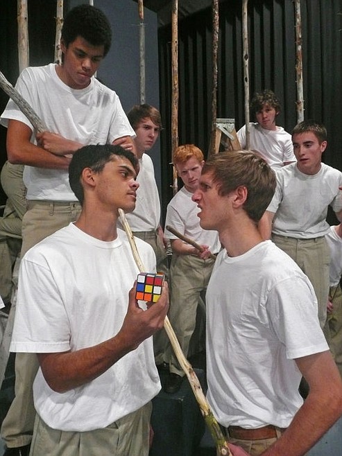 The cast of Flathead High School's production of "Lord of the Flies" includes, front row from left: Tristin Hennessey as Ralph and Zachariah Timm as Jack; and, back row from left: Micah Moore as Roger, Tanner Mack as Roberts, Keston Hemsley as Henry, Jaben Wood as Simon and Brock Reiner as Peter.