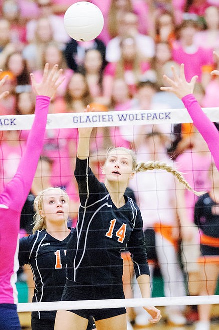 Thursday night during Glacier's victory over Flathead in a crosstown volleyball match at Glacier High School. Oct. 10, 2013 in Kalispell, Montana. (Patrick Cote/Daily Inter Lake)
