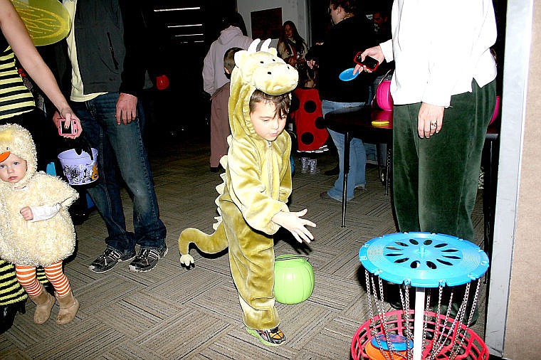 Austin Hotchkiss tries to toss a Frisbee® into the basket during a game at St. Regis Public School's Halloween Carnival. The night included other games, a haunted house and a trunk or treat event later in the evening.
