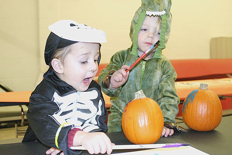 Aiden Skellenger, 3, and Trac Henkel, 2, work on painting pumpkins at Hot Springs' Family Fun Night.