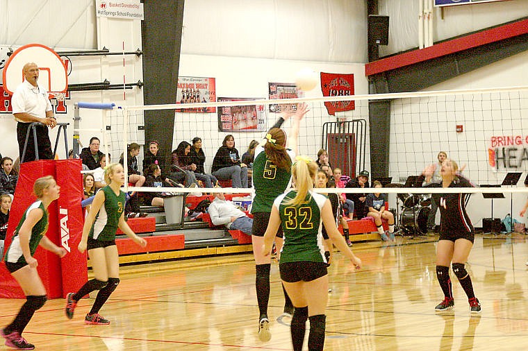 Junior Gabby Moeller knocks the ball across the net to Hot Springs during a game at the Regional Tournament. The St. Regis Lady Tigers will move on to the District Tournament this week as they continue their season finals.