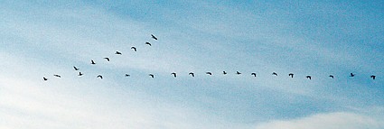 Flying in a “V” formation allows each bird, except the leader, to take advantage of the slipstream created by the bird ahead of it, similar to bicycle racers. This saves the birds energy and enables them to extend the range they are able to migrate. The leader can easily drop back into the line to take advantage of the lift.