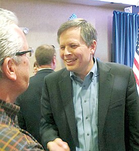 U.S. Rep. Steve Daines works the room at an event announcing his candidacy for the U.S. Senate, Wednesday, Nov. 6, 2013, in Bozeman, Mont. (AP Photo/Matt Gouras)