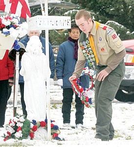Patrick Faulkner of Boy Scout Troop 1971, places a wreath as Stella Sharp, left, and Maria Wegner look on.