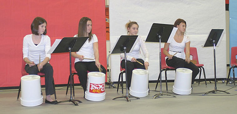 Rachel Huenink, Haley Josephson, Samantha Marquaradt-Brown, and Dakota Worrall perform the song "Buckets" as part of the percussion ensemble for the Middle School.