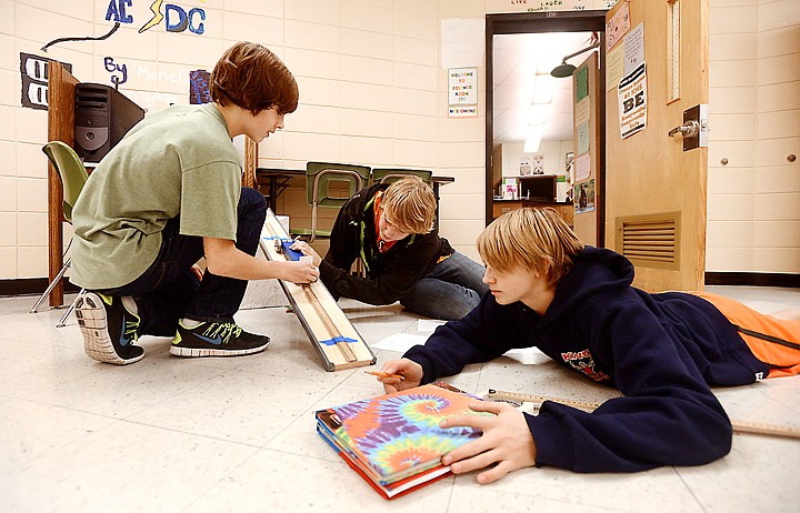 From left, Harrison Rennie, Jacob Uhde, and Bryce Shaffer work on a science experiment on Friday, November 15, at Kalispell Middle School. The students are using motion detectors and "crass test dummies" to learn about Newton's Laws of Motion and force, mass and acceleration. (Brenda Ahearn/Daily Inter Lake)
