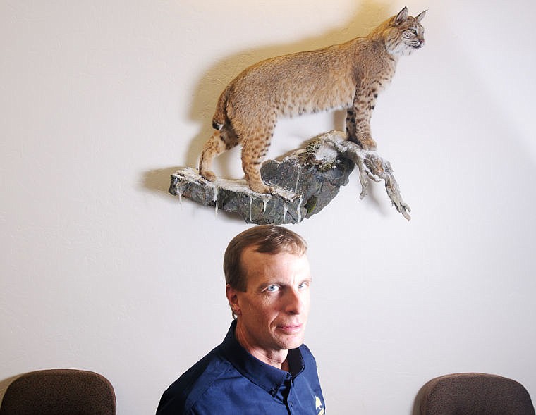 Mark Harwood, a project superintendent at Swank Enterprises and a player on MSU’s 1984 national championship team, poses with a bobcat mounted on the wall at Swank’s office in Kalispell. The cat was shot by Jim Noffsinger, also a Swank employee and ardent Bobcat fan.