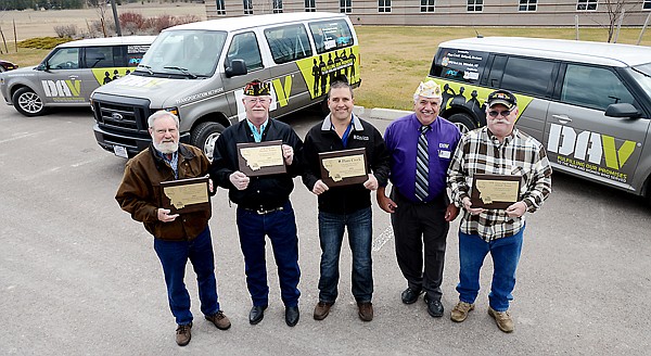 From left, John Babb, Dean House, Shane Stratton, Montana DAV Commander Joe Parsetich and Carey Dill gather in front of the three new Disabled American Veterans vans on Friday at the National Guard Armory north of Kalispell.