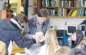 Advanced biology teacher Gene Reckin, second from left, holding a female grizzly bear skull explains how to age the animal. Johnny Davidson, left, India Croucher center, (white sweater) and Lily Feeback right (camo jacket).