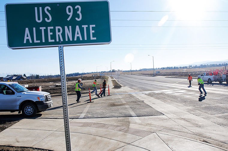 Road crew members remove traffic cones Thursday morning blocking the entrance to the U.S. 93 Alternate Route from Reserve Loop. The newest section of the U.S. 93 bypass opened to public traffic at around noon on Thursday. Nov. 21, 2013 in Kalispell, Montana. (Patrick Cote/Daily Inter Lake)