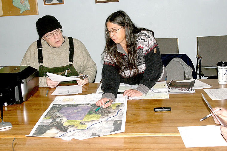 Dennis Hildebrand looks on as Timer Management Advisor Wanda Smith points out an area affected by the West Mullan Fire.