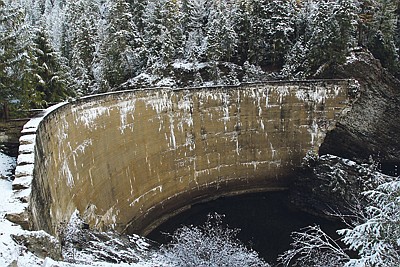 In 1923 and 1924, workers constructed the 50 foot high (one source says 58 feet) dam that is 150 feet long for $100,000. Within the concrete, railroad rails create a mesh on two-foot centers both horizontally and vertically. Engineers designed Eileen Dam as an arch dam because arch dams are not suppose to fail-- and it didn’t fail.