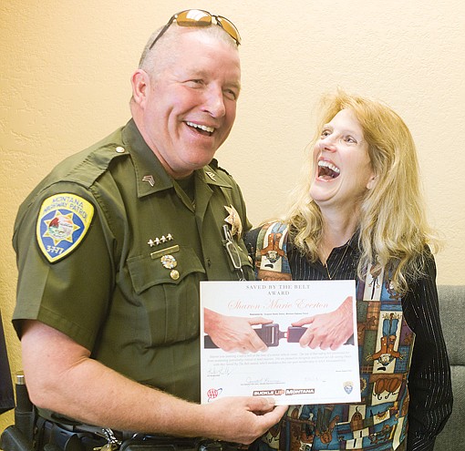 Owens presented Sharon with the Saved By A Belt award last week during a ceremony at MHP’s regional headquarters in Kalispell.