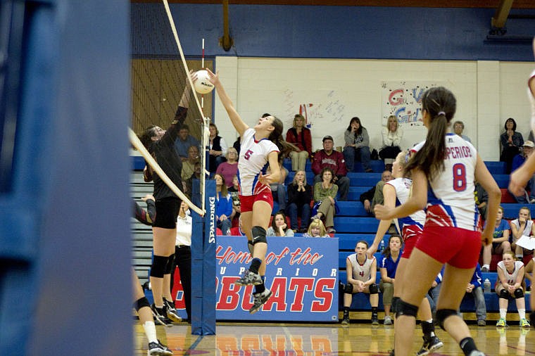 Superior sophomore Danielle Ewounik makes an athletic move to block a Granite spike during the Bobcats home game on Thursday night.