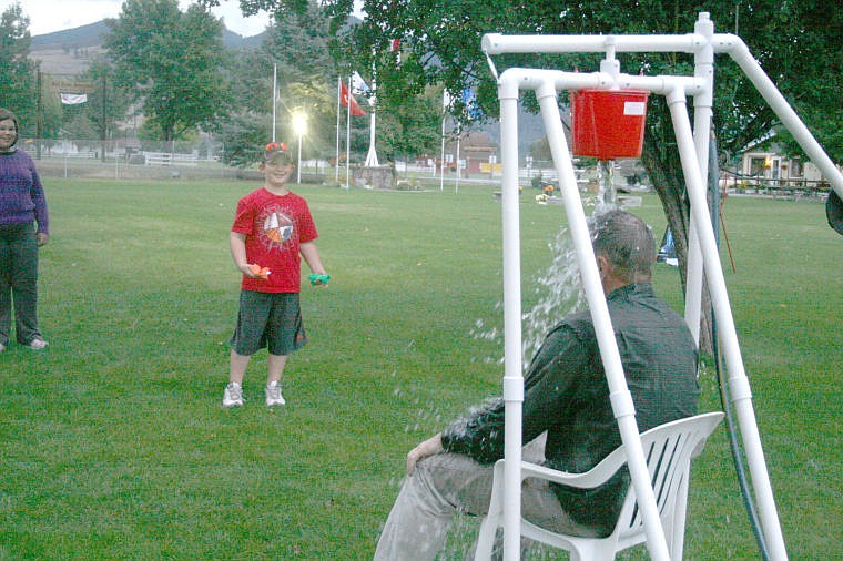 WSA President Cory Ovitt is doused because of the bean bag toss from Koby Carter during the Oktoberfest celebration at the Sanders County Fairgrounds Pavilion in Plains.