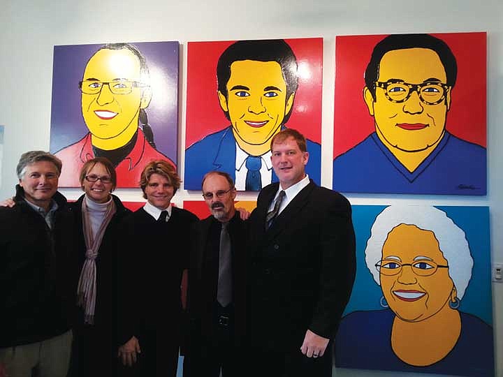 Many of those in attendance showed two faces, one in real time and color, and one that was big, bright and smiling, captured in large canvases on the wall, painted by Brent Blake. Portraits included Soap Lake mayor Raymond Gravelle, Brent Blake's significant other Anna Fazio, and architects Andy and Nell Kovach, of Everett. Stacks of televisions, another of Brent Blake's art installations, showed a series of events and projects the artist accomplished in his lifetime in the community.