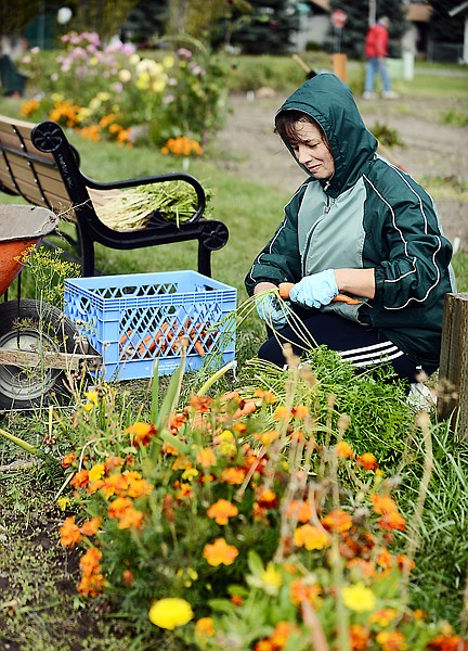 Nelli Difort of Kalispell harvests carrots from her plot at the community garden on Hawthorn Avenue in Kalispell Thursday afternoon. Difort will be taking some of the harvest to the Flathead Food Bank. When gardeners produce more food than they can use, they are encouraged to take the excess to the food bank.
