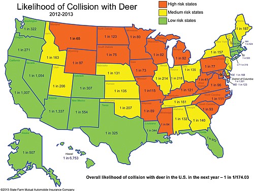 State Farm’s data shows that vehicle-deer collisions are most likely to occur in November, the heart of the deer hunting and mating seasons.