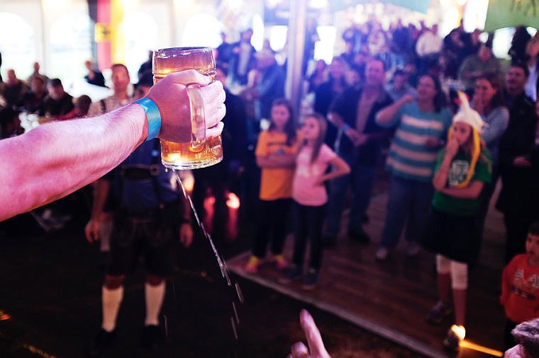 A contestant in the stein-holding contest struggles to keep up his glass Friday night during Oktoberfest at Depot Park in Whitefish.