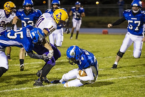 In the third quarter, Vikings linebacker Graham Thompson intercepted a pass, which led to Amos' 1-yard touchdown run. Defensive lineman Nick Haines and Thompson each had two sacks. Defensive linemen Austin Chadderdon and James Pierce each had one sack. Cornerback Jackson Carlson had one interception, as Coeur d'Alene defensive backs shut down Lewiston quarterback Drew Melton's deep attempts to receiver Andres Nunez.