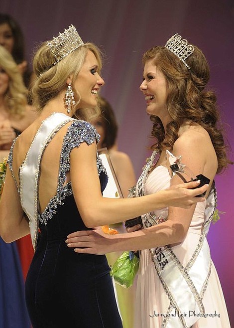 Kadie Latimer, left, celebrates with Madyson Rigg at a state scholarship pageant in Missoula on Sunday night. Latimer was crowned Miss Montana USA while Rigg won the Miss Montana Teen USA title. (Jerry & Lois Photography)