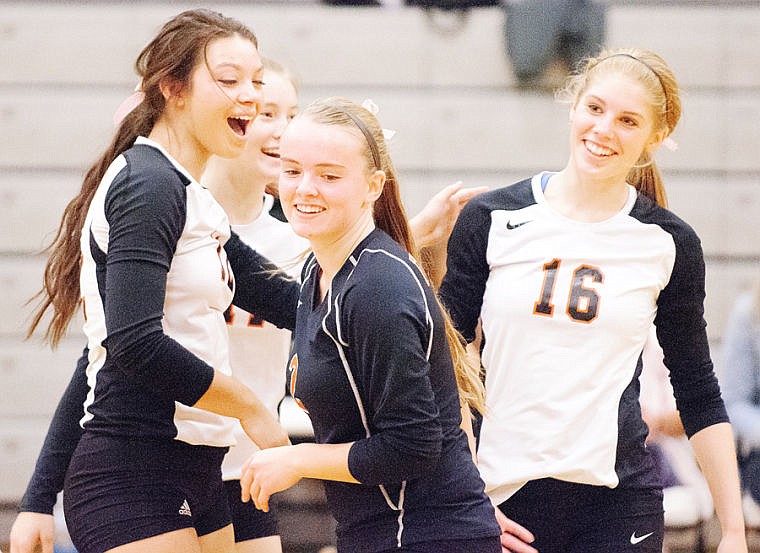 (Right to left) Emma Andrews, Iris Matulevich, Ashli Petek, and Lizzie Sherwood celebrate a point Tuesday night during Flathead's win over Missoula Sentinel at Flathead High School. Oct. 8, 2013 in Kalispell, Montana. (Patrick Cote/Daily Inter Lake)