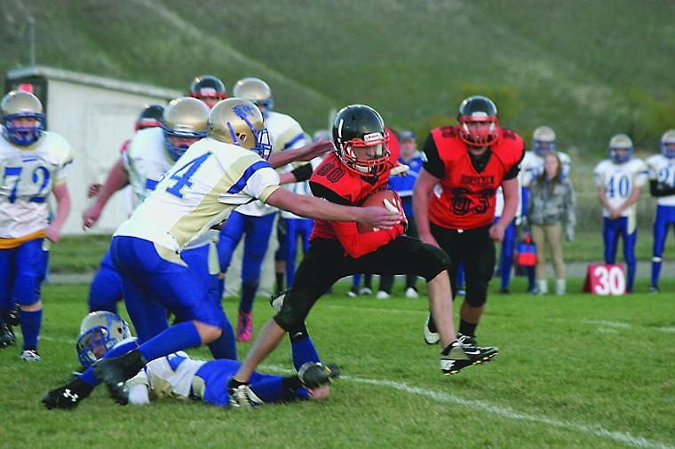 Horseman Trent Brouillette works his way further from the Bluehawks' defense during the Homecoming game.