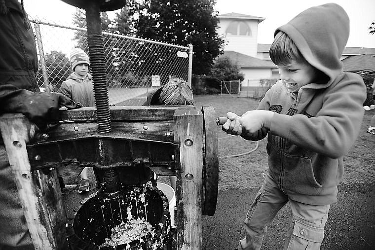 Winston Gray, a 1st grader at Kalispell Montessori works with an apple press helping make fresh apple juice on Thursday, October 10, at the Kalispell Montessori School. Students were treated to apple juice with their lunch. Students from Kalispell Montessori will be helping with the Harvest Fest at Woodland Montessori on October 30th. Admission to the event will be $5 and will include an haunted house, soup dinner and another apple pressing. (Brenda Ahearn/Daily Inter Lake)