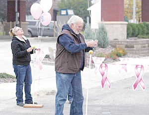 Glacier Bank's John Johanson ties a pink balloon to the finish line of Saturday's Paint It Pink Fun Run/Walk