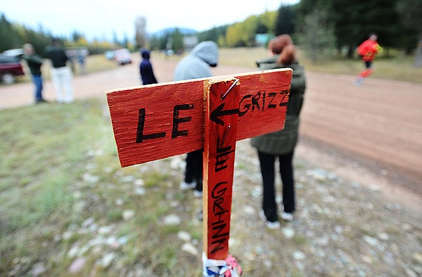 A sign pointing toward the Polebridge Mercantile and the finish of the 32nd Le Grizz on Saturday, October 12. (Brenda Ahearn/Daily Inter Lake)