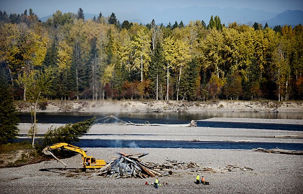 A crew works to burn a collection of logs on the Flathead River on Tuesday, October 15, east of Kalispell. (Brenda Ahearn/Daily Inter Lake)
