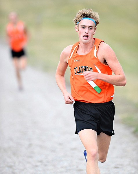 Flathead juniors Chance Kittle and Sylas Schutt (background) compete in cross country on Wednesday, October 16, in Kalispell. (Brenda Ahearn/Daily Inter Lake)