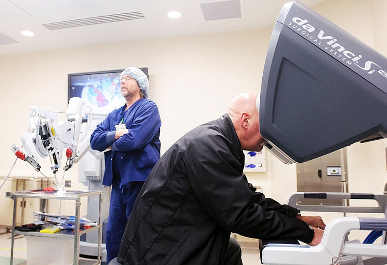 Robotics coordinator Randy Mansfield watches as Mark Sanman, right, plays with a da Vinci Surgical System robot Tuesday afternoon during an open house for the new surgical suite at North Valley Hospital in Whitefish. (Patrick Cote/Daily Inter Lake)