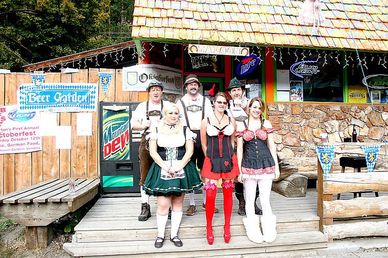 (Back Row:) Andreas Carson, Dave Hurrliman, John Zunski, (Bottom Row:) Yvanne Mames, Michaela Alberti and Priya Jopek show off their traditional German outfits at the first annual Oktoberfest.