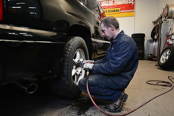 Snow Tire Season Dustin Martell installs a set of studded winter tires on Thursday morning, October 17, at the Les Schwab in Evergreen. (Brenda Ahearn/Daily Inter Lake)
