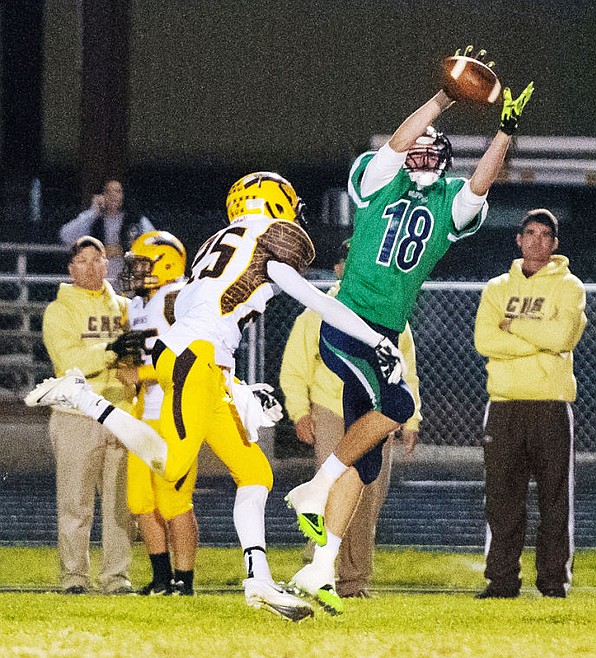 Glacier junior wide receiver Sam McCamley (18) hauls in a pass near the sideline Friday night during Glacier game with Helena Capital at Legends Stadium.