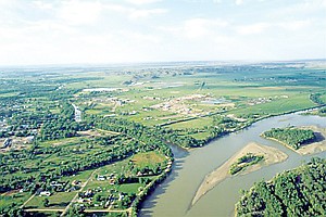An undated photo shows an aerial view of the confluence of the Tongue and Yellowstone Rivers at Miles City. A legal clash over water rights on the arid Northern Plains is bound for trial as attorneys for Montana press their case that Wyoming farmers and oil and gas companies are sucking too much water from tributaries of the Yellowstone River. (AP Photo/Billings Gazette, Larry Mayer)