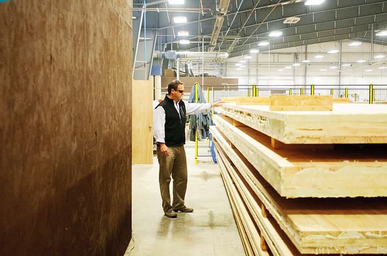SmartLam product development manager Pete Kobelt looks over a stack of cross laminated timber products Tuesday afternoon at the SmartLam plant in Columbia Falls. Oct. 22, 2013 in Columbia Falls, Montana. (Patrick Cote/Daily Inter Lake)