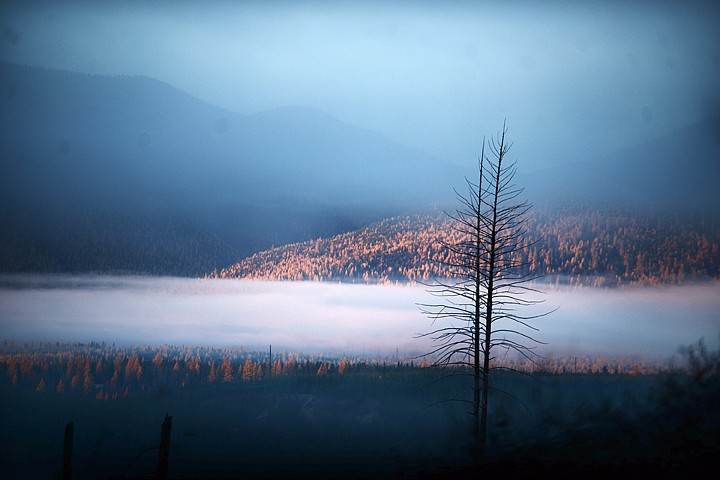 Tamaracks glow in the first rays of a foggy sunrise over Polebridge on Monday, October 21. (Brenda Ahearn/Daily Inter Lake)
