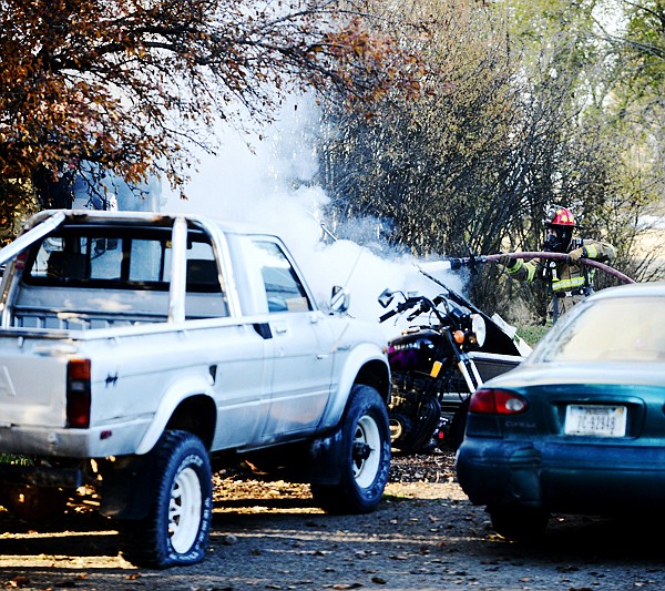 Capt. Kirk Pederson of the Kalispell Fire Department works on putting out the fire.